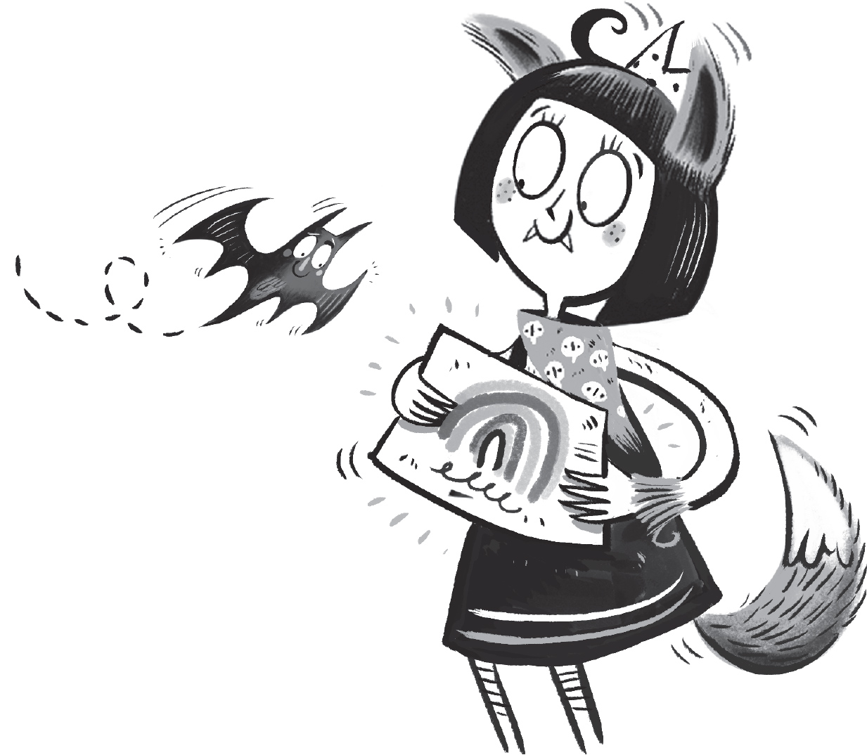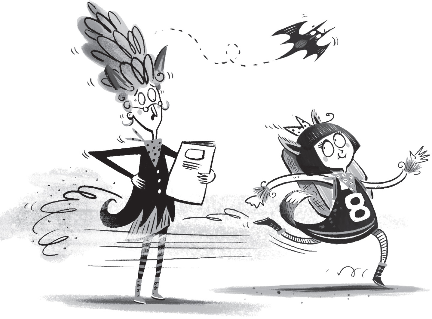 Lottie looked at the clock, gasped and jumped to her feet. ‘Oh, no! I’m going to be late!’ And next minute she was rushing out of the door. Jaws, her bat, was dozing on the top of a picture; he woke up with a jump and flew after her, only just managing to whizz through the door before it shut.