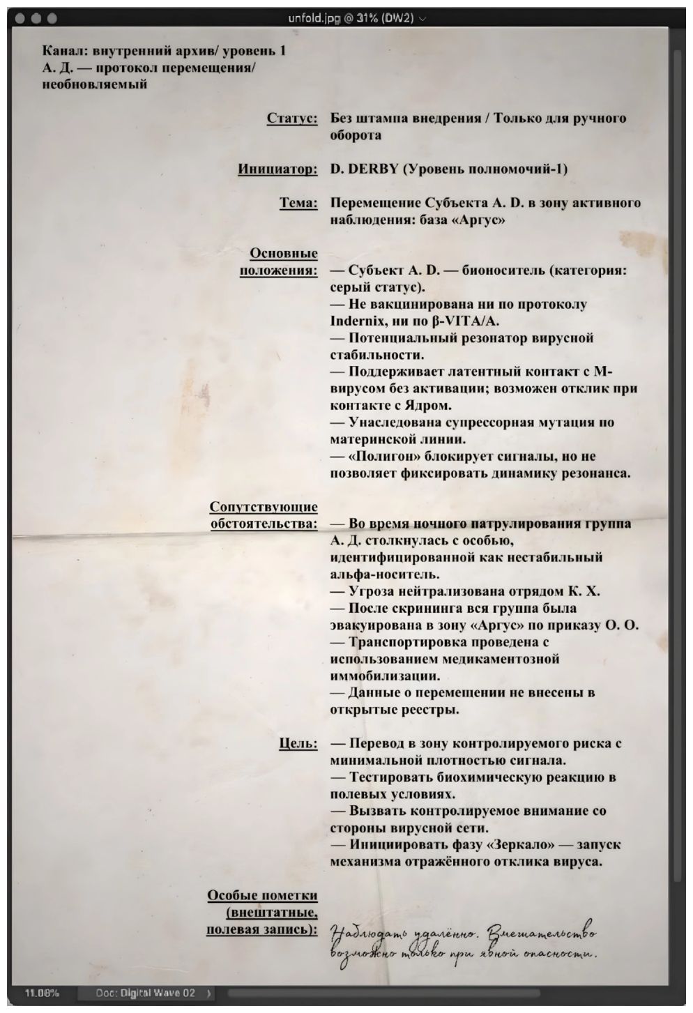 – И то и другое, – быстро отвечает она. – Информация, не прошедшая по официальным каналам. Подписи, полевые штампы. То, что отфильтровали из главного отчёта, но сохранили вручную.