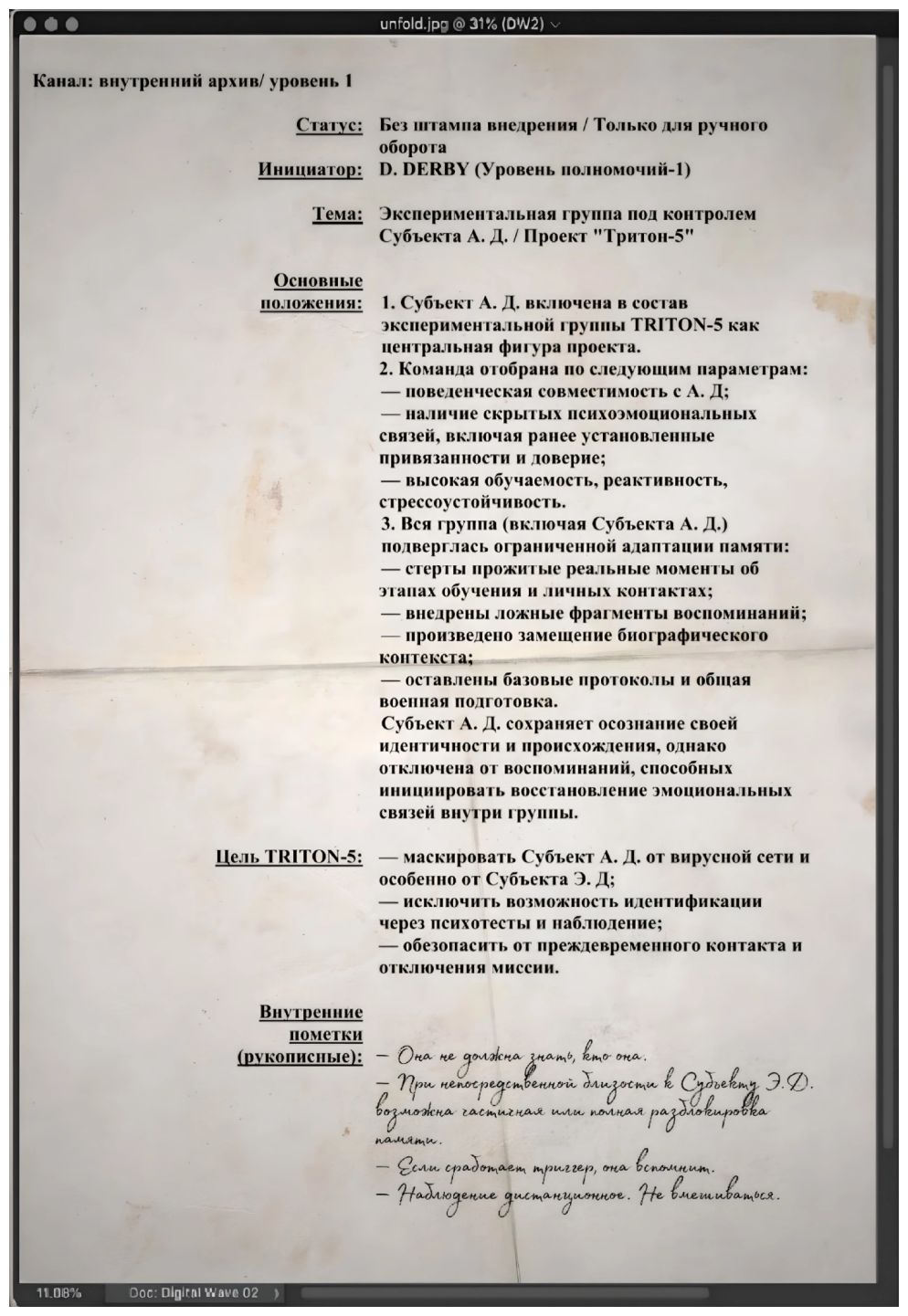 – Проект «Тритон–5»… – повторяю я вслух. – Значит, Ариадне стёрли память и внедрили ложные фрагменты, собрали команду, заточенную под её восприятие и уровень доверия, а спустя годы их всех вместе закинули на Полигон.