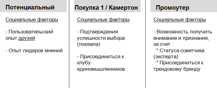 Вспомните еще раз социальные факторы, влияющие на первом этапе: отзывы друзей, отзывы лидеров мнений.