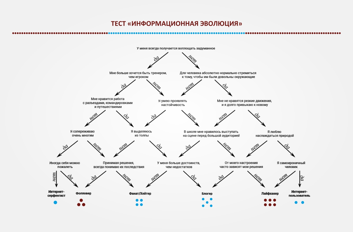 Пожалуйста, ответьте на вопросы в тест-открытке и узнайте, на каком этапе информационной эволюции вы сейчас находитесь, насколько далеки от ее вершины. Кто вы – Интернет-серфенгист, Интернет-пользователь, которые только начинают свое восхождение, Фолловер, Фанат/Хейтер на промежуточных ступенях, Блогер или Лайфхакер, которые достигли ее пика?