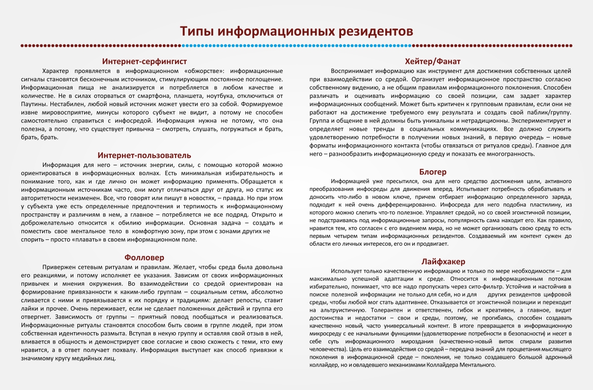 В этой своеобразной лаборатории есть информационные платформы, на каждой «сидит» свой тип пользователя, и он, этот пользователь – информационный резидент, видит мир именно таким, каким «видит» его платформа; он одобряет, тянется к ней и боготворит ее как носителя абсолюта информации, как истину в последней инстанции. Есть поклонники YouTube-каналов, инстаграм-аккаунтов, вк-пабликов, и эти поклонники в своих предпочтениях информационной пищи (инфопотребления) очень схожи между собой в поведении в реальной жизни. Одни из них поглощаются средой и становятся информационным планктоном, а у других получается сохранить баланс или даже преодолеть силу информационного давления.