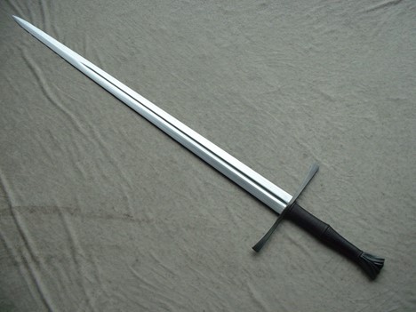 Сам клинок возле гарды был не толще трех пальцев взрослого человека, обоюдоострый, наконечник был достаточно острым, чтобы наносить колющие удары. Рукоять была перетянута черной кожей, навершие было в виде цветка похожего на тюльпан. (Бастард)