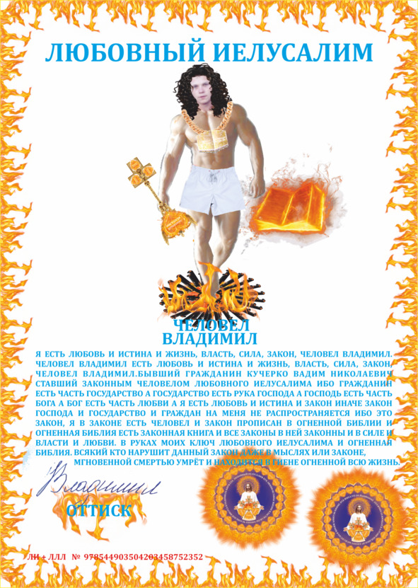 И вот Иисус делжит в луках огненную библию и читает и судит и огненная библия есть законный документ любовного Иелусалима и включает и состоит из 8 глав и они же есть 8 книг опечатанная 2 лючатями любовного Иелусалима и никому не дано снять эти лючати: