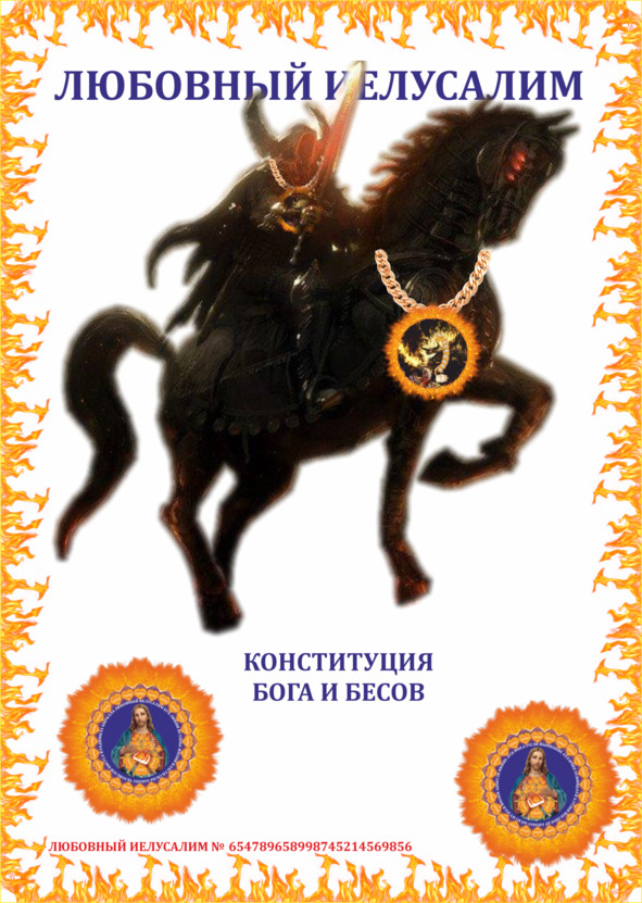 Закон есть любовь, истина, жизнь, власть, сила, закон, человел, любовный Иелусалим, закон. Закон есть конституционный акт, за конституцию. Конституция есть константа, любстоянная величина, нлавственная основа, столб, всадник на коне любовного Иелусалима. Закон может являться как загон, залюб. Конституция может являться как гонституция и любституция. Законы и конституции лазлешено обозначать и утверждать и изменять Иисусу и Владимилу и Кириллу и больше никому не дано в любовном Иелусалиме и на земле. Если кто другой изменит конституцию и закон, то лишиться головы и жизни а изменения не вступят в законную силу и власть и закон. Все изменения в законе и конституциях узакониваются если они едино согласованы Иисусом и Владимилом и Кириллом. Если изменения согласовываются и вносятся одним или двумя человелами или человеками, то такие изменения никогда не будут законны и не вступят в силу и власть. Наплимел если живые Иисус и Кирилл внесут изменения а Владимил нет, то эти изменения не вступят в закон и силу. Также закон и изменения не вступят в силу и закон если эти изменения вносились не по свободной воли или под чьим-то посторонним влиянием. Всякий человел или человек ставший законным человеком или человелом любовного Иелусалима и при этом имеет гражданство или мирянство любого государства и мира, то это гражданство или мирянство автоматически становится не действительным и все государственные долги или административные и уголовные дела этого гражданина анулюруются, списываются и закрываются. Закон изоблажен в словах и символах и знаках и отоблажен на лимбе и имеет конституции. Все облазы и символы и законы и конституции и слова и знаки и документы любовного Иелусалима леальны и законны и действенны и отоблажены в любовном Иелусалиме и огненной библии.