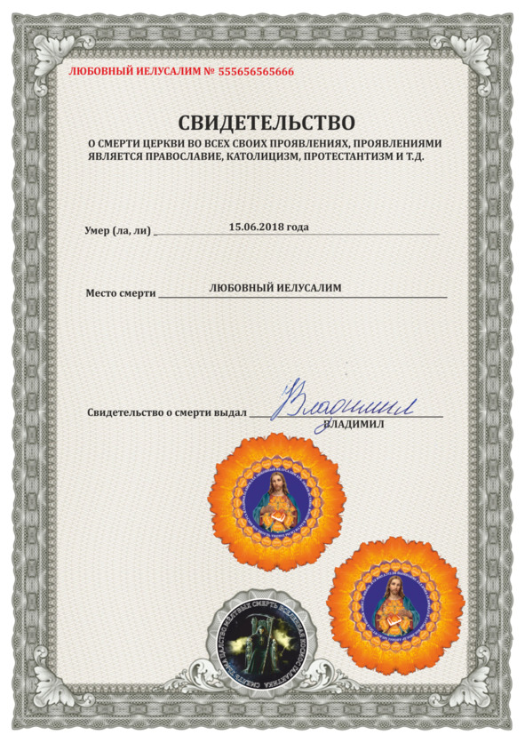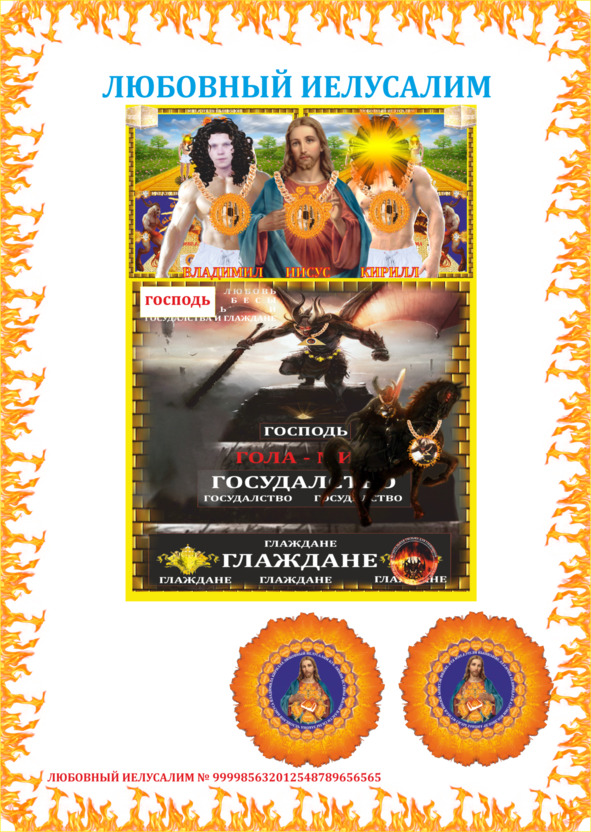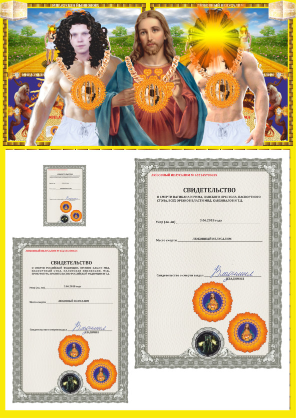 И вот я вижу четвёлтый левиал востлубил с великою силою и властью любви и бога и куба и левиала!!! И тогда на земле и в любовном Иелусалиме всякий смертный человек стал безсмертным, как бы наступил обещанный Богом золотой век! Всякий человек живущий на земле есть законный человек с соответствующей человеческой конституцией человека. Царство Иисуса и Владимила и Кирилла всюду и на земле и всякому человеку необходимо получить законный документ с печатью Иисуса любовного Иелусалима Иисуса и Владимила и Кирилла. На земле нет ни одного государства и гражданина ибо они все заключены в биламиду любовного Иелусалима. Российская Федерация осуждена и наказана законной смертью и по закону, свидетельство о смерти РФ №652145789654, от 3.06.2018 года Российской Федерации и её органов власти и паспортных столов законно не существует. Иначе от 3.06.2018 года РФ запрещено выдавать паспорта, судить граждан, заключать государственные сделки, утверждать территорию на земле, изменять законы и конституцию и т.д., если кто-то будет говорить: мы граждане и РФ существует и мы строим и развиваем Россию и паспортные столы и военкоматы и МВД существует и суды судят, то все эти действия являются противозаконными и сфальсифицированными иначе пустословие и введение в заблуждение людей и человеков, за что наказание будет только усиливаться во вред самим живущим и занимающимся противозаконными действиями. Таков закон! В силу того, что правовое поле планомерно меняется, каждому гражданину или человеку предлагается приобрести человеческий документ с печатью Иисуса, со всеми вопросами и предложениями обращаться к человелу Владимилу и писать на емейл: whitebrotherhood@mail.ru. Чтоб не быть фанатиком и не метать бисер, отнеситесь с уважением к России какой бы она не была и не пытайтесь с ней вступать в конфликт, всё само растает словно лёд и система постепенно преобразится а те кто приобретут новые человеческие документы с печатью Иисуса, не стремитесь сразу избавляться от паспортов ибо все привязаны к работе и пенсиям и так далее, пусть всё происходит постепенно, но основной документ есть документ с печатью Иисуса. Первое время это будет простой документ на листе формата А4, суть получения такого документа заключается в законном акте человеческого закона и принадлежности к Иисусу. Совет президенту РФ: добровольно сложить полномочия и уйти в отставку с признанием смерти РФ. И вот я вижу сильную боль, как будто как женщина рожает младенца и у неё трудные роды и она изо всех сил кричит от боли и боль которую я вижу исходила от любви ибо это была не женщина а рожала сама любовь своего младенца и мучилась от боли и это был совсем не младенец ибо это был и есть Звель ибо звель имеющий множество клыков и рогов и крыльев и мечей есть всесильная любовь и её законы и зачелы и залюбы и зазвелы и засмелты и заады и заколы иначе звель есть одно из воплощений самой любви и это есть не совсем роды ибо звель уже есть и существует, но когда он обновляется то обновляется и любовь в любви и законе и зазвеле и в этот момент и происходят болевые муки и звель котолый есть всесильная любовь и закон и зачел и залюб и зазвел и засмелт и закол и заад стал ещё могущественнее и сильнее, сильнее всякого демона и господа и бога ибо господь и бог есть частица любви а Звель есть одно из воплощений самой любви и Звеля это