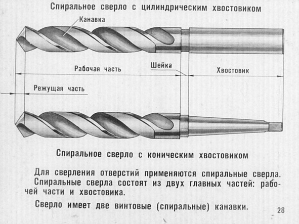 В этой части самоучителя вы должны осмыслить и понять для чего предназначено сверло. Моя подборка материала даст вам возможность это совершить и в дальнейшем воспользоваться знаниями. Сверло по металлу – это специальный инструмент для сверления в различных металлах отверстия разного диаметра. Свёрла бывают разных видов и назначений. Диаметр свёрл тоже разнообразен. Мне пришлось пользоваться сверлом диаметра 65 мм. На рисунке вы видите устройство основного сверла, применяемого в токарном деле. По форме это цилиндрический стержень с двумя режущими кромками с одной стороны и хвостиком с другой. Хвостовики бывают конусные и цилиндрические.