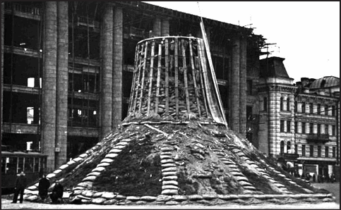 Улица Комсомола, д. 41. Вероятно, август-сентябрь 1941 г. Здание универмага недостроено. Часть соседнего доходного дома еще цела