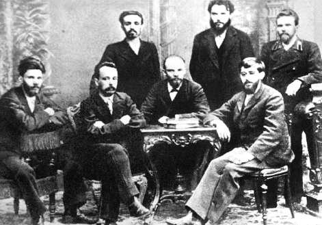 Члены петербургского «Союза борьбы за освобождение рабочего класса». Слева направо (стоят): А. Л. Малченко, И. K. Запорожец, A. A. Ванев, слева направо (сидят): В. В. Старков, Г. М. Кржижановский, В. И. Ульянов, Ю. О. Мартов. Санкт-Петербург, 1897 г.