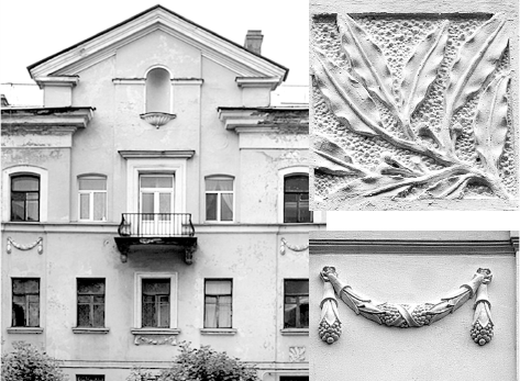На участке № 23–25 в послевоенное время построили трехэтажное здание, стилизованное под архитектуру раннего классицизма, с характерным для этого стиля желтым цветом и декором: окном-люкарной, украшенным цветочными гирляндами и сандриками, на фоне почти голой, лишенной украшений, стены.