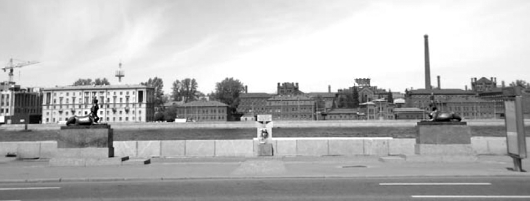 Между сфинксами на парапете набережной стилизованное окно тюремной камеры с решеткой