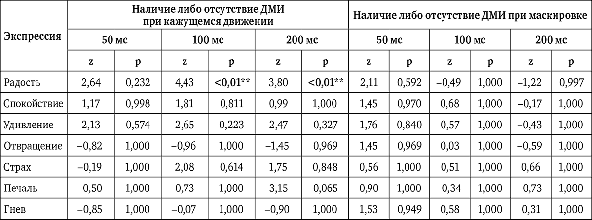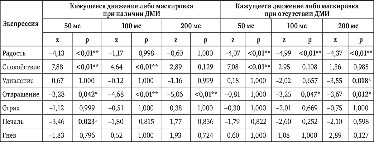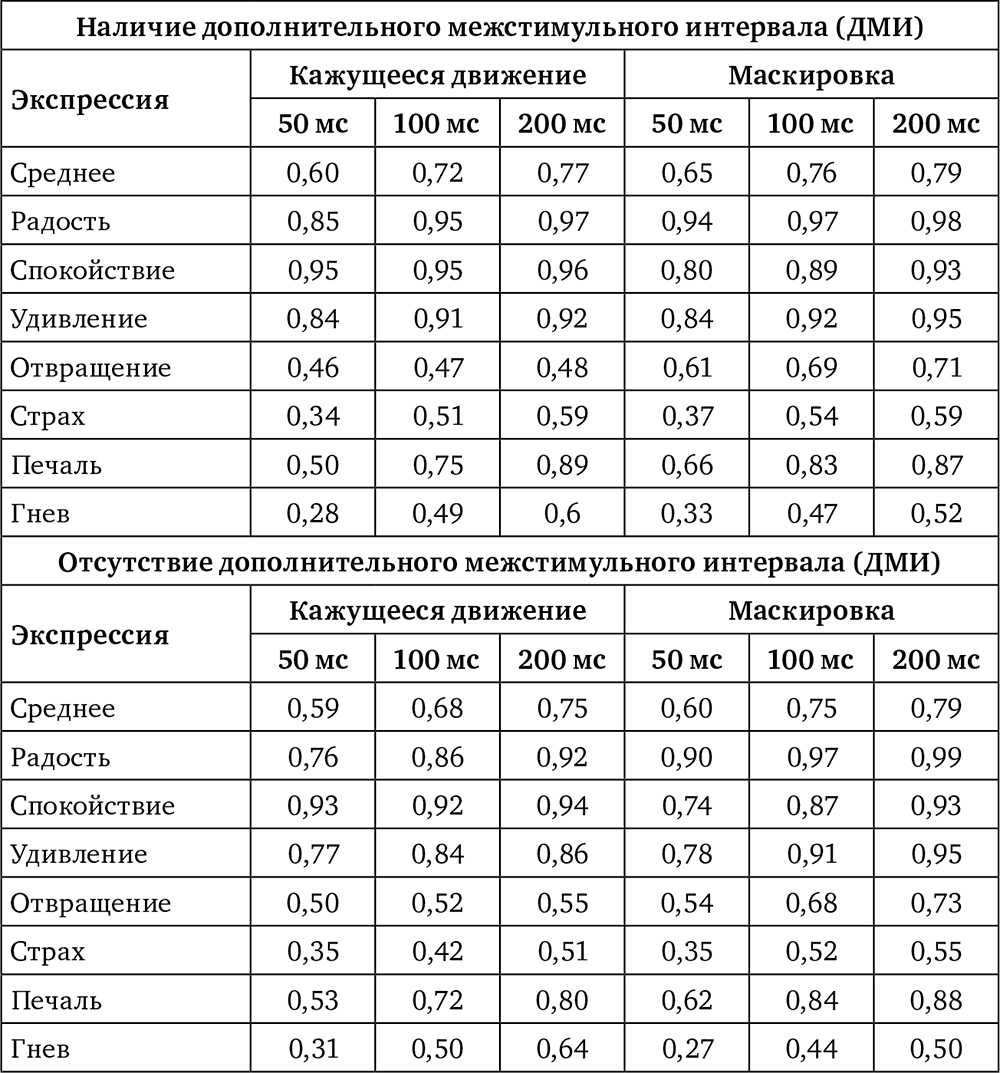 По сравнению со стробоскопической экспозицией прямая и обратная маскировка экспрессий незначительно повышает точность оценок (таблица 2.6). Тенденция проявляется при восприятии эмоций радости (на 50 мс – как при наличии, так и при отсутствии ДМИ; на 100 и 200 мс – только при его отсутствии), удивления (на 200 мс без ДМИ), отвращения (при любом времени экспозиции с включением ДМИ, а при 100 и 200 мс – в его отсутствие) и печали (на 50 мс при наличии ДМИ). Для экспрессий страха и гнева значимых влияний контекста не выявлено. В случае спокойного лица точность оценок при стробоскопическом движении оказывается выше (на 50 и 100 мс с ДМИ и на 50 мс – без ДМИ), что связано с неизменностью экспозиции спокойного лица, которое демонстрировалось с небольшим сдвигом относительно контекстных изображений. В условиях кажущегося движения сдвиг воспринимался более отчетливо, чем в условиях маскировки. Аналогичный эффект наблюдался и в описанных ранее исследованиях (Барабанщиков, Королькова, Лободинская, 2014, 2015).