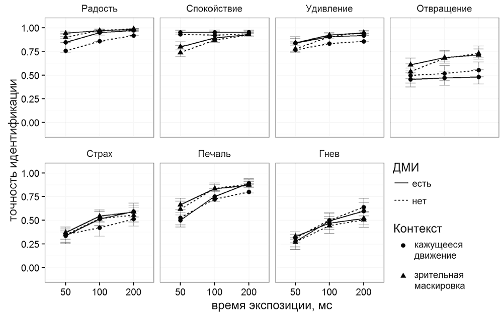 Роль временнóй организации материала. Основной результат выполненного исследования состоит в том, что наличие или отсутствие паузы в 20 мс, разделяющей первое контекстное и тестовое изображения базовой эмоции (ДМИ), само по себе ни в условиях стробоскопического движения, ни в условиях зрительной маскировки практически не влияет на восприятие экспрессий. Наибольший вклад в точность распознавания базовых эмоций вносят их модальность, длительность экспозиции и взаимодействия модальности с содержанием контекста. Слабое влияние ДМИ на эффективность восприятия опосредовано его взаимодействием с другими контролируемыми переменными: модальностью эмоции, контекстом и длительностью тестовых изображений.