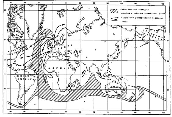 Схема 2. Направления развертывания немецких подводных лодок и районы действий немецких надводных кораблей во второй мировой войне