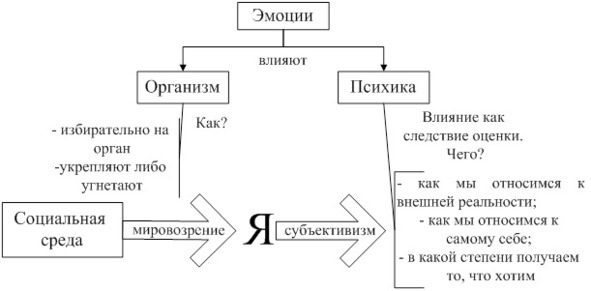 Эмоции – это очень индивидуальные колебания психики (образно – цветовых волн ауры). Субъективизм (наше ЭГО, иначе говоря) определяет, как именно они проявляются, а субъективизм, в свою очередь, зависит от ценностей, принципов, нравственных установок нашей культуры, мировоззрения (это говорит о тесной взаимосвязи эмоционального и социально-культурного интеллекта).