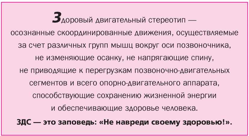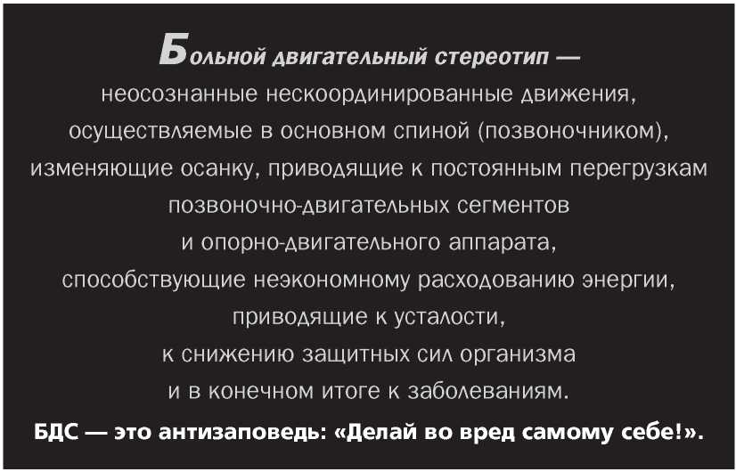Многолетний опыт работы мануальным терапевтом, постоянное наблюдение за больными людьми, за тем, как они выздоравливают, привели меня к умозаключению, что многие заболевания опорно-двигательного аппарата, в частности остеохондроз, развиваются в результате нарушения человеком здорового двигательного стереотипа. Беру на себя смелость ввести в литературу этот новый термин.