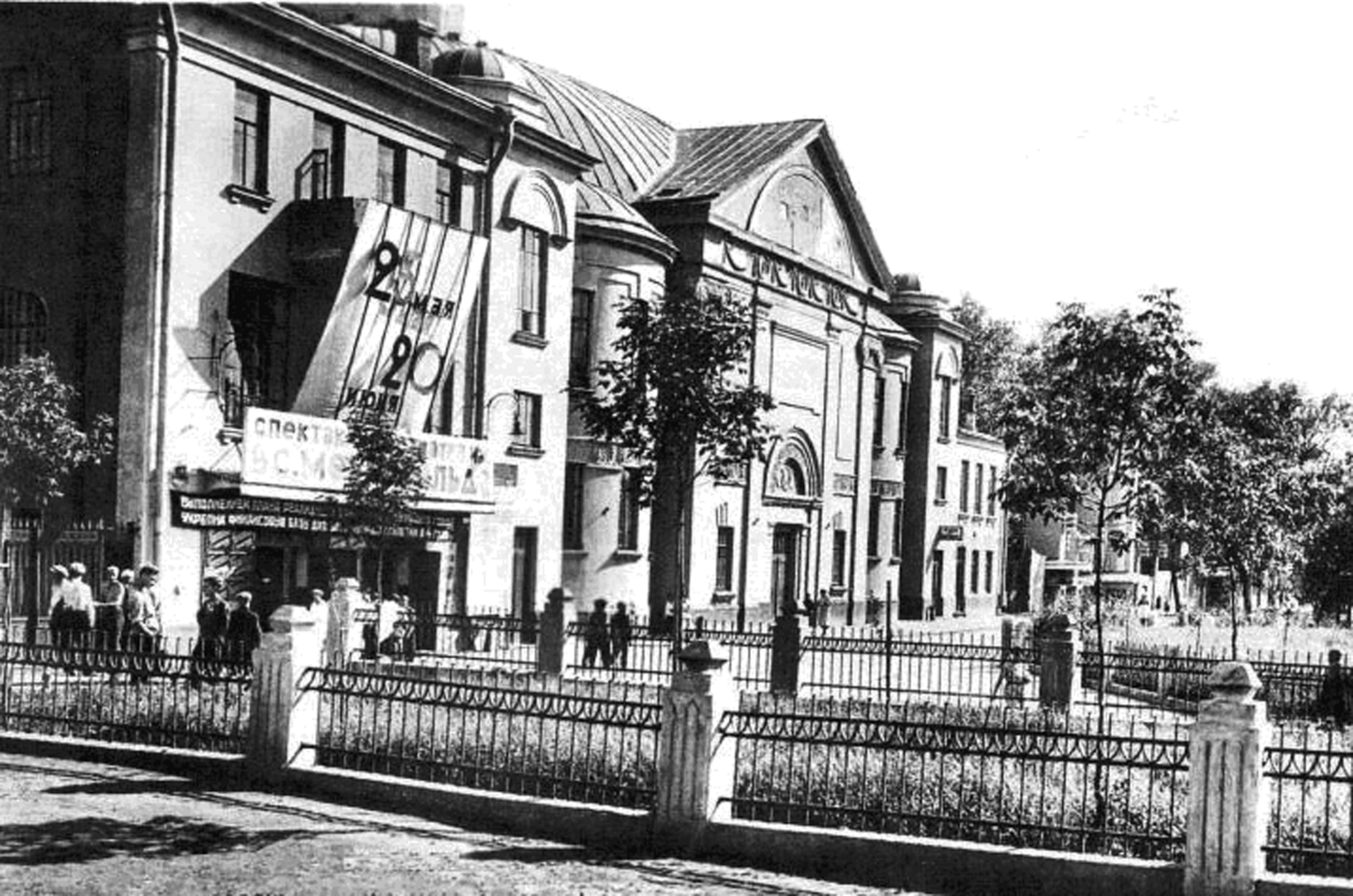 1920-е годы. Вид на Триумфальную площадь со стороны Большой Садовой улицы. Театр Мейерхольда в здании бывшего театра «Буфф» и справа от него – Мюзик-холл в здании бывшего цирка Никитиных.