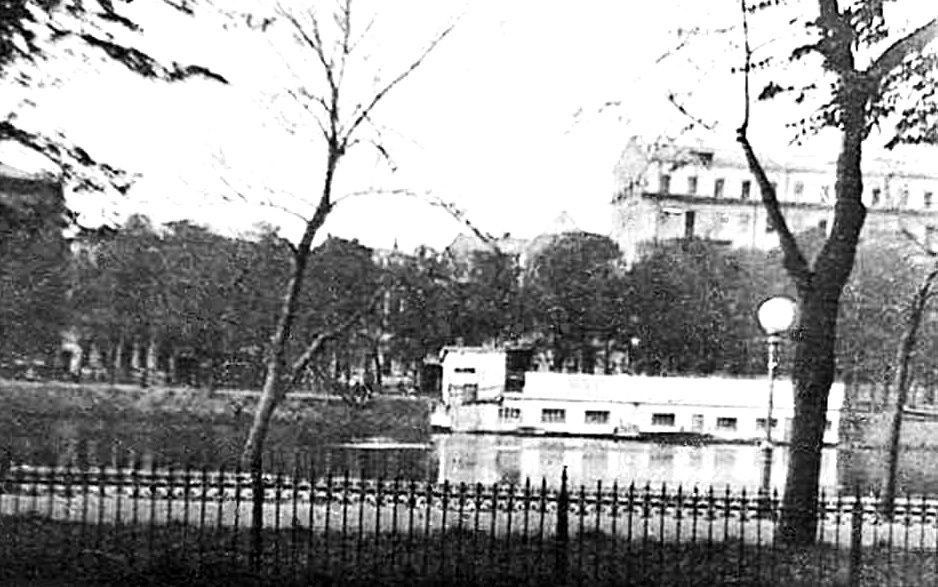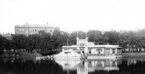 1913 г. Павильон лодочной станции на Патриаршем пруду. На заднем плане – дом № 7 по Ермолаевскому переулку