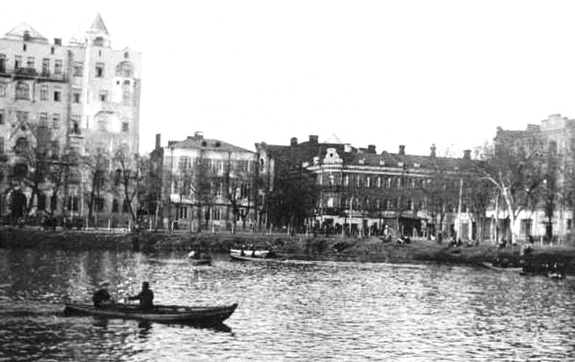 1900-е гг. Каток на Патриаршем пруду. На заднем плане – дом Левенцовой на Малой Бронной, где в 1886 году архитектор Анатолий Гунст организовал «Классы изящных искусств для лиц обоего пола». Позднее на этом месте был построен дом Вешнякова