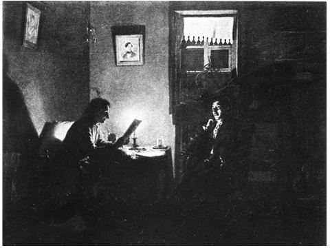 Пушкин у Гоголя. Художник М.П. Клодт. Гравюра Ю. Барановского. 1887 г.