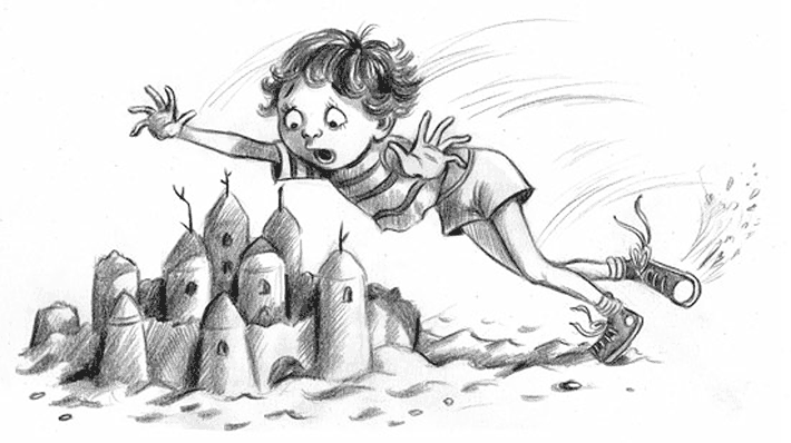 На берегу моря, по которому шли Петров и Васечкин, возвышались песочные замки, над строительством которых трудились несколько малышей. Васечкин нагнулся было, чтобы помочь одному из них, но тот, испугавшись, отпрянул, и Васечкин, которого к тому же ещё нечаянно подтолкнул сзади заглядевшийся на что-то Петров, полетел прямо на замки, приведя их в состояние полной негодности. Малыши подняли страшный рёв, и Васечкин огорчённо двинулся дальше.