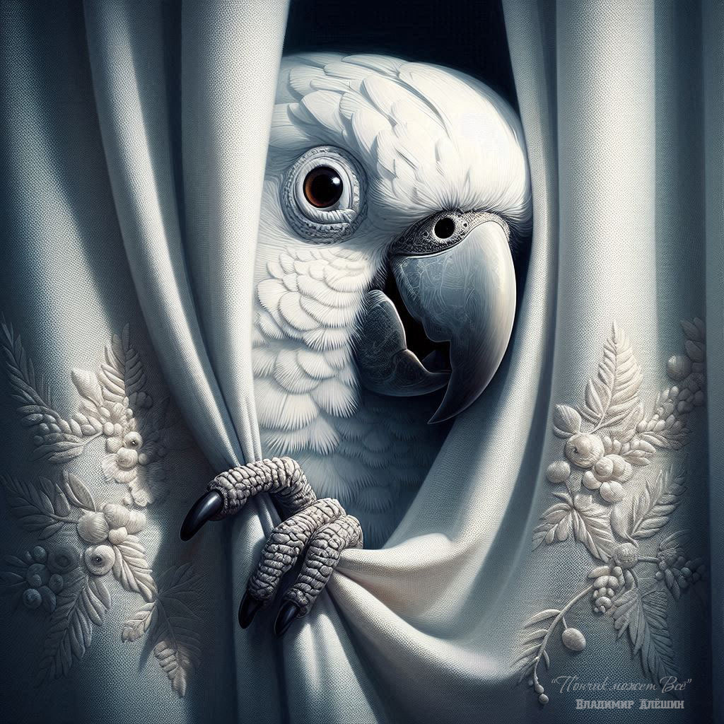 Это был обычный день. Пожилой мужчина по имени Геннадий Петрович, как обычно, придя с работы и уютно расположившись в любимом кресле у окна, решил немного подремать. И вот, только он прикрыл глаза и немного расслабился, как вдруг, на большой скорости, в его открытое окно влетел большой белый попугай, который тут же спрятался за его бежевой шторой.