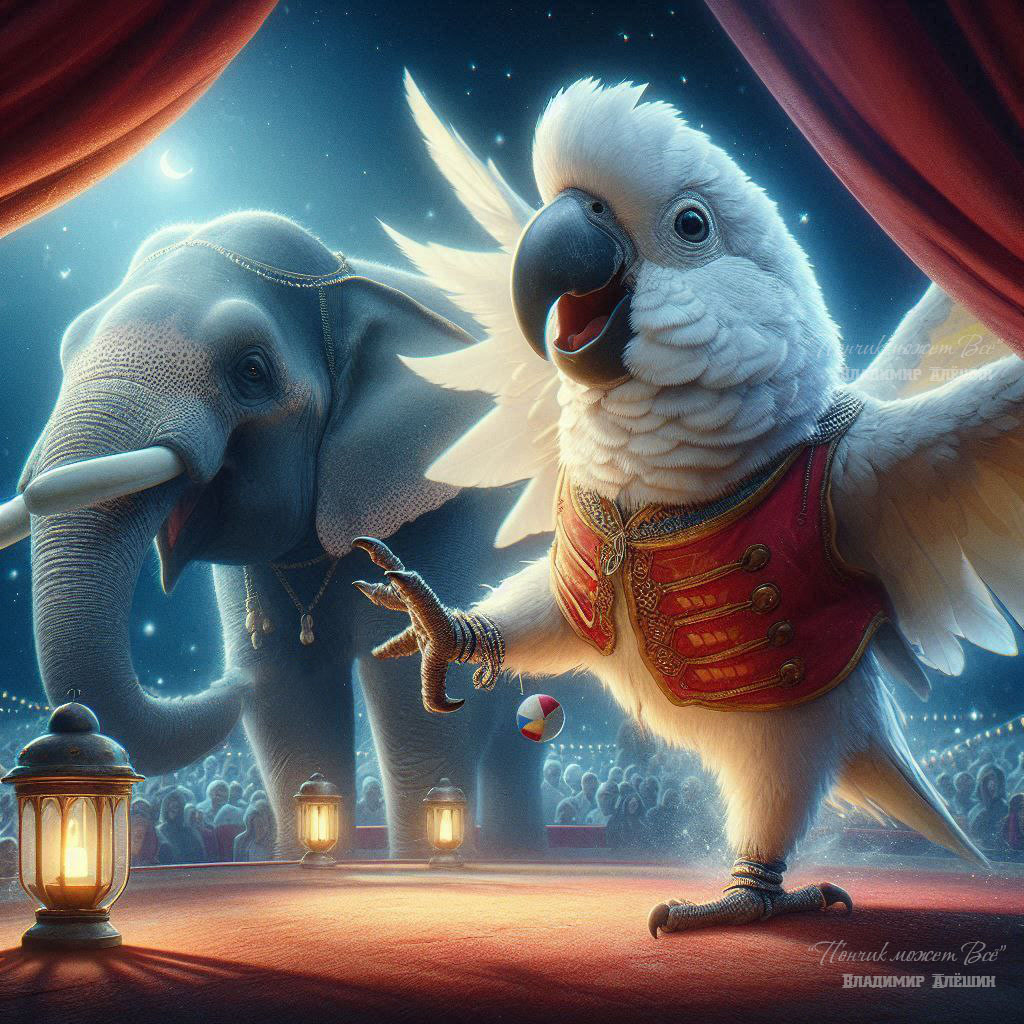 И именно с ним у меня было много цирковых номеров. Например, Туман бросал мне разноцветные мячи, а я должен был их ловить лапами или клювом, а потом ими жонглировать. Или я садился к нему на хобот, и он медленно поднимал меня вверх, а я в это время, стоя на одной лапке, выполнял различные акробатические трюки, например делал сальто, кувырки или вращения.