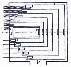 Больших успехов в передаче информации с помощью микролептонов добился Охатрин А.Ф. Он построил приемник и передатчик, информация межу которыми распространялась намного быстрее скорости света, а сам сигнал невозможно было экранировать никакими способами [9]. В мае 1985г. в лаборатории А.К. Геворкова (СФТИ) была разработана, изготовлена и испытана малогабаритная высокоградиентная линейная ускоряющая структура на основе встроенных вложенных один в другой четвертьволновых коаксиальных резонаторов, схема которой приведена на Рис. 3.