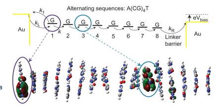 В исследовании, опубликованном в издании Nature Chemistry, Ли Мин Цзян, Хулио Палма, Кристофер Бруо и другие из Института биодизайна университета штата Аризона изучили пути, которыми электрические заряды передвигаются вдоль ДНК, прикрепленных к паре электродов [16].