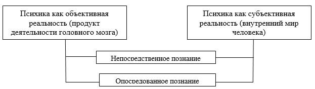 Психика (внутренний мир, субъективная реальность) как объект онтологического исследования представляется объектом субъективного познания («изнутри») и объектом объективного познания («извне»).