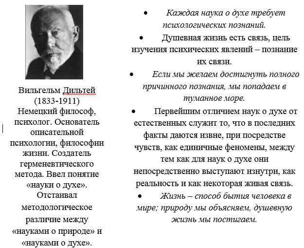 В. Дильтей считал, что специфика всех методологических приемов в науках о духе (гуманитарных науках) заключается в использовании понимающих методов исследования. Он впервые поставил проблему логических форм понимающей деятельности в науках о духе, ограничил сферу применения рациональных методов понимания. В жизненном единстве целого существует непознаваемая рациональными методами часть, для исследования которой нужны особые методы: сопереживание, вчувствование, симпатическое проникновение во внутренний мир Другого. Границы логическим методам установлены самой природой объекта познания. Логическим способом выражения элементарной (истолкование отдельного проявления жизни) и высшей (истолкование жизненного целого и внутреннего мира людей) форм понимания является, согласно концепции Дильтея, аналогия и индукция соответственно.
