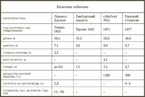 В США в 1825 г. Уильям Джонс составил первое подробное техническое описание парового ледокола, в том же году опубликованное на русском языке {2}. Автор предлагал поддерживать зимнюю навигацию на реке Делавар в Филадельфии с помощью деревянного колесного парового судна с 2 специальными устройствами – «ледоколами». Прочные штевни корпуса «должны быть <изготовлены> в форме лука и располагаться весьма наклонно к горизонту, чтобы судно пересекало лед наискосок и давило его вниз». Подводная часть судна обшивалась «толстыми железными листами от форштевня до ахтерштевня и на 0,45 м выше ватерлинии и до самого киля», а бортовые гребные колеса во всех частях предполагалось обшить железом. «В оконечностях судна следует установить ледокол в виде крестообразных конструкций из железа с круглыми молотами весом в 8-дюймовую бомбу на концах спиц. Оба ледокола находятся на одном подпалубном валу, приводимом во вращение паровой машиной».