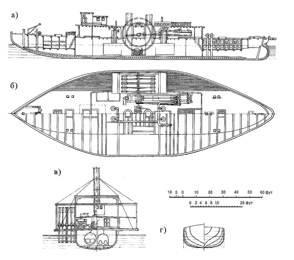 Рис. 004. Колесный ледокол «Айсбоут № 2»: а) продольный разрез; б) план по верхней палубе (сверху) и план трюма (внизу); в) поперечное сечение по машинно-котельному отделению; г) проекция «корпус» теоретического чертежа