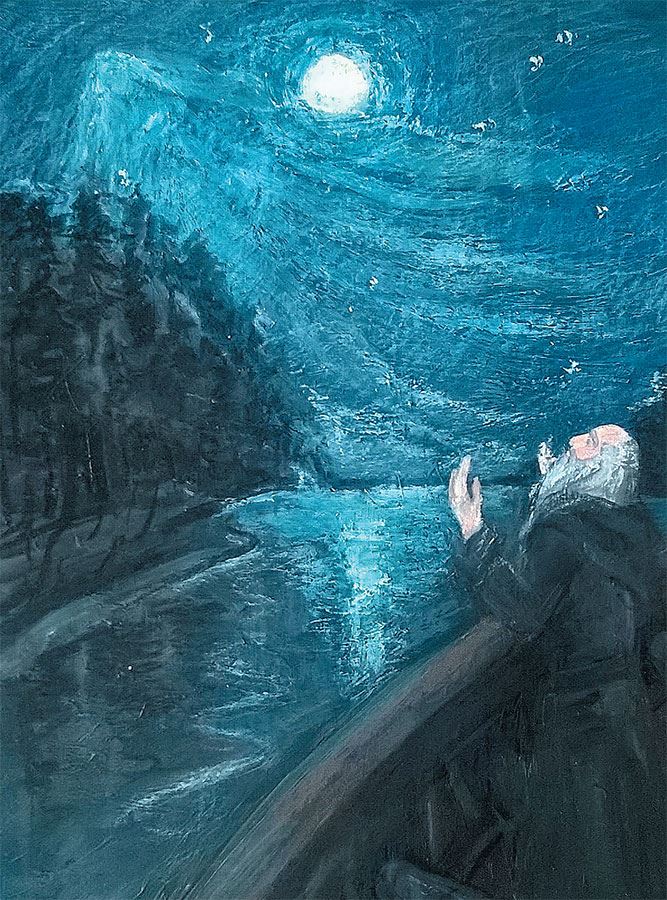Она присела на борт лодки рядом с онемевшим Алешкой и скинула с головы платок. Густые рыжие волосы, освобожденные от плена, рассыпались по плечам. Не глядя на Алешку, она тихо заговорила, как будто вела разговор сама с собой, и он жадно вслушивался в звуки незнакомой карельской речи. Язык этот был причудлив: неровен, как будто кто-то шел по извилистой лесной тропинке, перескакивая через камешки, но изобилие звука «л» придавали ему мягкость и текучесть. Алешка, с горящими от восхищения глазами, подперев голову рукой, сидел тихонько. Он чувствовал, что слова ее для него, и это знание сердца уже не удивляло его.