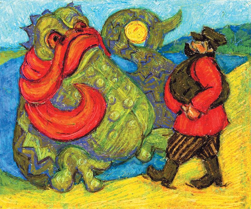 – Ефрем, Ефрем, смотри! Что это я вытащил?! – кричит Иван. Ефрем от неожиданности аж весла в воду выронил – не ждал он таких эмоциев! Весла подобрали, смотреть начали. Держит Иван в руках кошель кожи тонкой, работы доброй, а в нем с фунта[226] полтора червонцев золотых. Единственно только, что тиной все заросшее. Как запрыгали, как заплясали Ванька с Ефремом в лодке, будто дети. «Уррра! Урра!» – один кричит. «Нашёл! Нашёл!» – второй. Как на берег выскочили, то там весь народ снова сбежался! Одни «Ура Крестовому!» кричат, другие в затылке чешут. Как такое чудо может быть, чтобы на реке с лампою кошели с деньгой ловить? Тут не без нечистой силы! У третьих от зависти аж глаза загорелись. Ну, что же, – все люди, все человеки! Но и пяти минут не прошло, как начались здесь чудеса еще почище, о чем ещё много лет здешние судачили да детям-внукам пересказывали! Послышалось сначала, что на реке, что-то забурлило, заклокотало да волны пошли, как будто от колесного пароходу с Питера. А как в ту сторону посмотрели, а там – страх! – всплывает из глубины чудовище вроде бревна али лодки перевернутой с мерзкой налимьей мордою, длиною с саженей[227] десять. Да всё в тине и водорослях зеленых, склизких! Аж болотом вокруг повеяло. А глаза-то – страх! – с тарелку добрую, лупастые, нечистые! А лапы-то мерзкие, пупырчатые, как у жабы или лягушки! Их чудище на песок речной-то и уложило. Такое увидев, сначала бабы с девками как завизжат! Да и кто куда! А за ними вслед и мужики со всех ног от греха подальше! Самые смелые только из-за дальних кустов на чудище посмотреть осмелились. Остальные с мольбою по домам да по углам. Один Иван остался на берегу, даже Ефрем и тот со страху сбежал. А чудище тем временем запыхтело-заговорило, как тот паровоз, на котором Иван от Киева до Питера ехал.