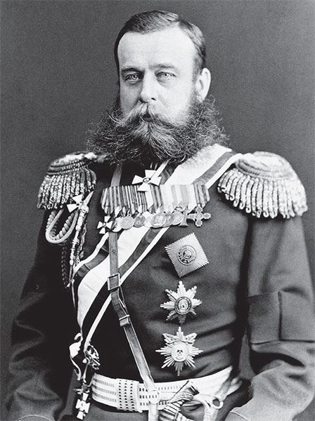 «Вот докурю сигару, и надо уходить», – подумал он. Вдруг, внезапно затихший гул голосов заставил его повернуть голову направо к двери, ведущей в танцевальный зал. Она распахнулась, и вошёл государь. Музыка оркестра, исполнявшего вальс Шуберта, неслась за ним легкими тактами. Император был не один. Две дамы и низенький лысый господин составляли его компанию. Одну даму лет тридцати в длинном платье цвета лила, которую Александр вел под ручку Скобелев не знал, но зато был о ней много наслышан. Это была пассия государя, некоронованная императрица, с которой он имел почти не скрываемую связь, Екатерина Михайловна Долгорукая[233]. Александра втайне многие осуждали за эту связь. И царь это прекрасно знал. Но также знали, что императрица, страдающая туберкулезом, уже как год не поднимается с постели, и рано или поздно фаворитка займет ее место, и, вероятно, официально. Долгорукой были выделены в Зимнем несколько помещений, где она и разместилась с четырьмя детьми, рожденными от царя. Последний ребенок – девочка – появился на свет в этом году, и все знали, что Александр дочку буквально боготворит. Поэтому всё шло как шло, и все делали вид, что так и должно идти. Вторая дама, а ее Скобелев тоже не знал, была фрейлина двора императрицы Варвара Шебеко[234]. Собственно, связь Александра и Екатерины Долгорукой, тогда ещё воспитанницы Института благородных девиц, завязалась с ее легкой руки. Все трое оживленно о чем-то беседовали.