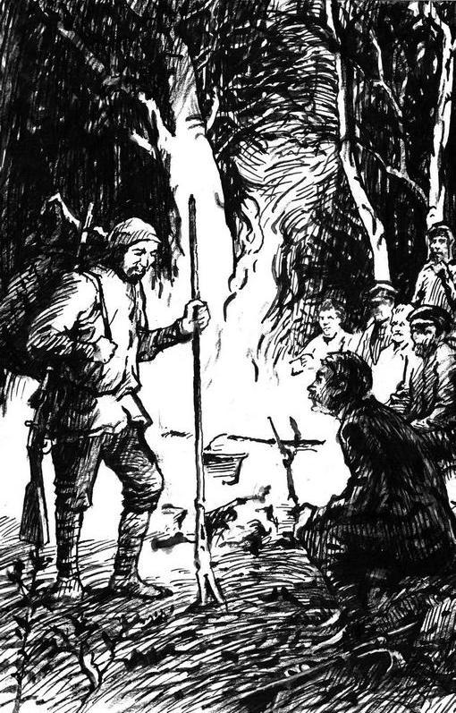 Пока он ел, я продолжал его рассматривать. У его пояса висел охотничий нож. Очевидно, это был охотник. Руки его были загрубелые, исцарапанные. Такие же, но ещё более глубокие царапины лежали на лице: одна на лбу, а другая на щеке около уха. Незнакомец снял повязку, и я увидел, что голова его покрыта густыми русыми волосами; они росли в беспорядке и свешивались по сторонам длинными прядями.
