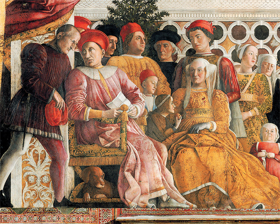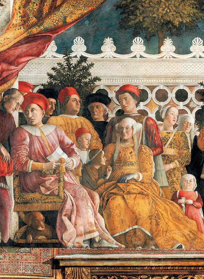 Эта сцена, изображающая заказчика (в неофициальном наряде) и его жену Барбару Бранденбургскую, сидящую в окружении сыновей с их женами и детьми, находится на северной стене Камеры дельи Спози в Палаццо Дукале в Мантуе.