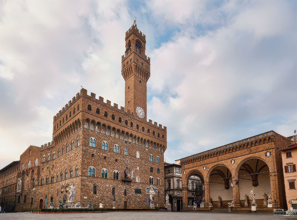 Палаццо Веккьо был построен по образцу более раннего административного здания Палаццо Тоскана в городе Вольтерра, но выглядит более монументальным и единым. Здание имеет необычный для светской архитектуры облик: оно построено в виде оборонительного форта с зубчатыми стенами и сторожевой башней.