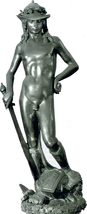 Естественная нагота молодого героя с длинными волосами, отрубленная голова Голиафа, лавровый венок, поверх шляпы героя живая реалистичная драма, заключенная в бронзу. После появления обнаженного «Давида», фигуры «ню» становятся неотъемлемой частью искусства.