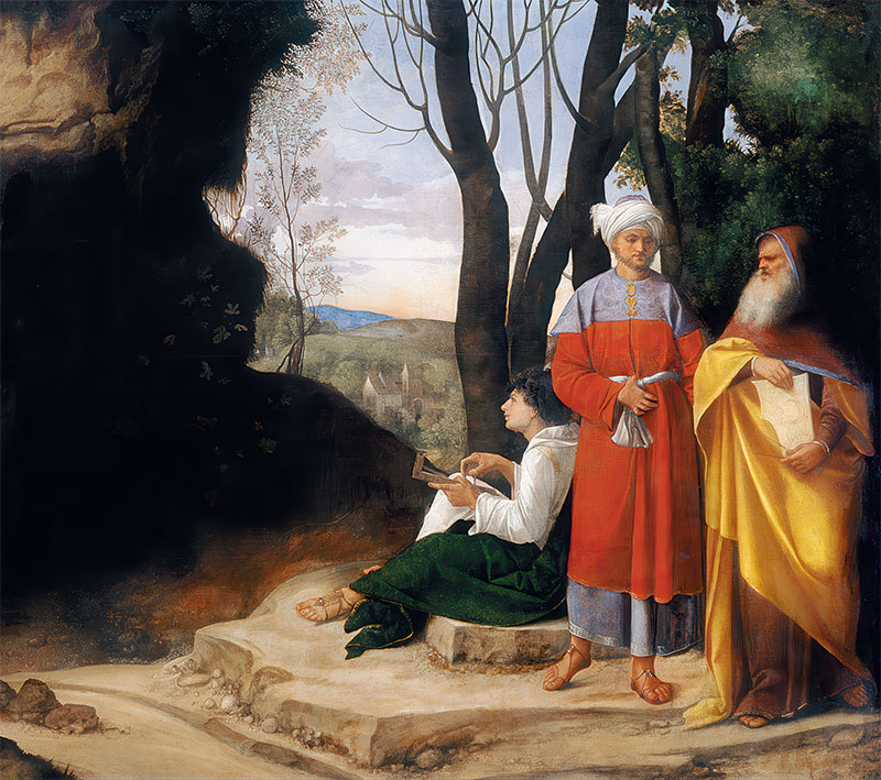 После Джованини Беллини основные пути венецианской школы былы подхвачены его учениками: Джорджоне, а позднее Тицианом. Джорджо Барбарелли да Кастельфранко родился в 1476 или 1477 г. в городке Кастельфранко венецианской провинции. В 1493 г. Джорджоне перебрался в Венецию и поступил в мастерскую Джованни Беллини, у которого многому научился и получил прекрасную школу колористического мастерства. В 1497 г. появилась его первая самостоятельная работа – «Христос, несущий Крест». В 1504 г. кондотьер Туцио Костанцо в память о сыне поручил Джорджоне создание алтарной композиции «Мадонна с младенцем на троне между св. Франциском и св. Либералисом» («Мадонна Кастельфранко») в соборе Кастельфранко, которая стала самой знаменитой из работ живописца. В этом произведении Джорджоне полностью отошел от канонического написания «святого собеседования»: мадонна Джорджоне – не религиозный символ, а прекрасная земная женщина. В другой своей ранней картине, «Юдифь», Джорджоне также стремился воплотить возвышенный эстетический идеал. Его стройная и нежная Юдифь предстает перед зрителем как носительница светлого, чистого начала в жизни. Ранний период творчества Джорджоне завершает полотно «Три философа».
