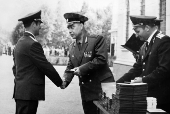 Вручение председателем государственной комиссии лейтенанту А. А. Рахманову диплома об окончании МВИЗРУ и золотой медали