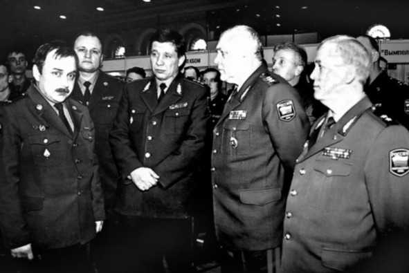 Научно-техническая конференция в Туле. Обмен мнениями за чаем в перерыве. Справа налево: генерал армии А. М. Московский, генерал-лейтенант А. А. Рахманов, академик А. Г. Шипунов. 2004