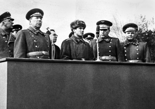 Выступление слушателя А. А. Рахманова на митинге МВИРТУ. Слева начальник училища генерал-лейтенант Н. Г. Филатов