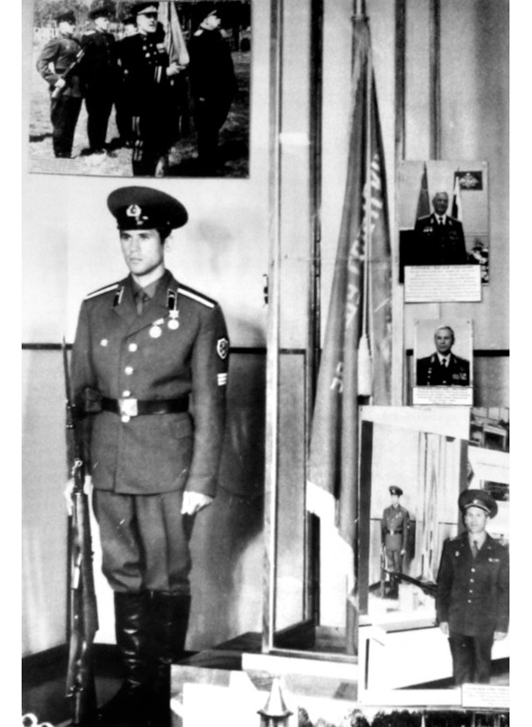 Слушатель 3-го курса А. А. Рахманов у знамени училища на 1-м посту. Фото из музея МВИЗРУ