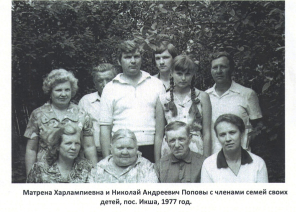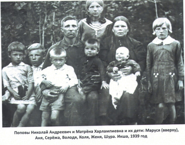 В поселке Икша они построили рядом два дома – на улице Коммунистическая и на улице Почтовая. В этих домах проживали многодетные семьи: семья Попова Андрея Павловича (два сына и три внучки) и семьи его сыновей -Попова Николая Андреевича (в его семье было восемь детей) и Попова Василия Андреевича (в его семье было семь детей).