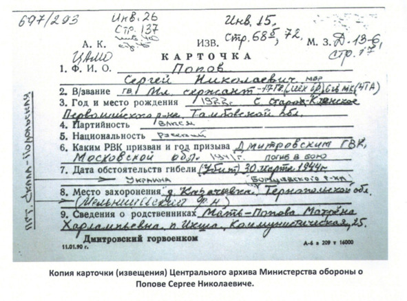 Сын Попова Николая Андреевича Сергей Николаевич 1922 года рождения воевал в составе механизированной бригады Четвертой танковой армии. Он погиб 30 марта 1944 года в бою при освобождении Тернопольской области (Западная Украина) и похоронен в братской могиле в поселке Скала Подольская Тернопольской области. Сергей погиб, когда ему было от рода всего 22 года.