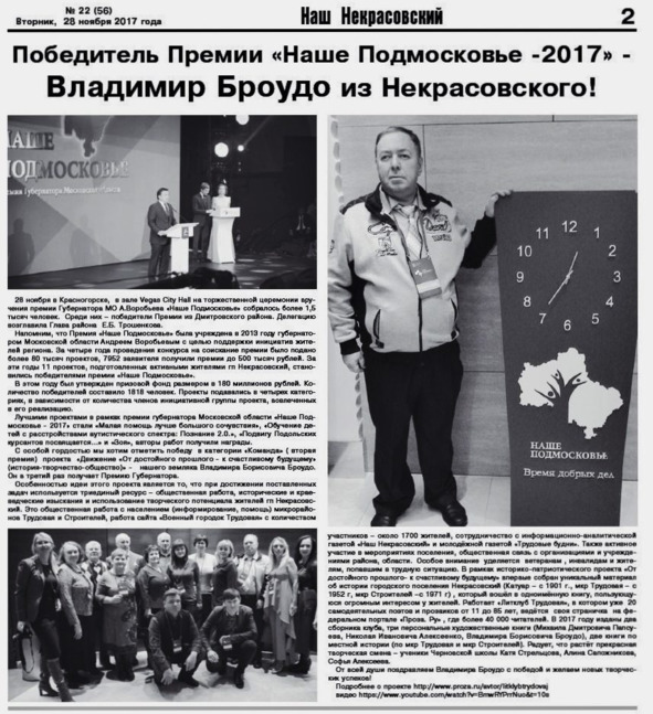 – Владимир Борисович Броудо (Трудовая) и (местная история и краеведение) «Некрасовский рубеж. О подвигах советских воинов в битве за Москву в районе современного городского поселения Некрасовский Дмитровского района Московской области»