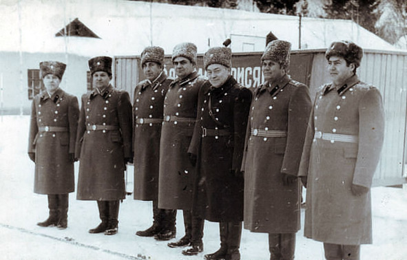 Построение частей Катуаровского (Трудовского) гарнизона на плацу в связи с началом зимнего периода обучения. Слева направо: командир войсковой части 03251 полковник Суббботин В. П., командир войсковой части 52147 полковник Шушко Г. И., начальник политотдела войсковой части 52147 полковник Беляков В. И., начальник штаба войсковой части 52147 полковник Зайцев П. И., командир войсковой части 11291 полковник Андреев С. И.,заместитель командира войсковой части 52147 по тылу полковник Синицын М. Н., главный инженер войсковой части 52147 подполковник Горскин А. Т. Фото 1982 г.