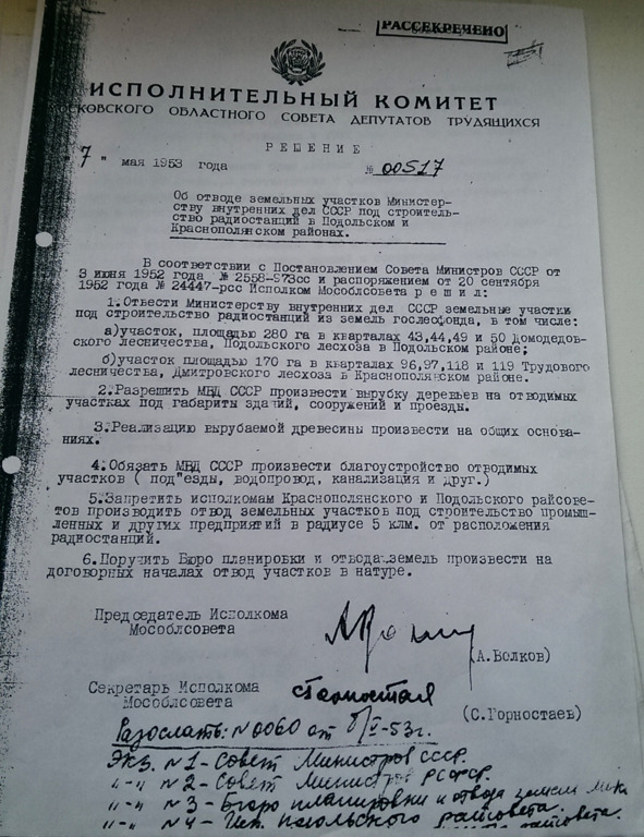 Стройрайон Главспецстроя МВД, возглавляемый полковником Нехороших, в 1951—1955 годах вел строительство – вырубал лес, засыпал болото, бетонировал площадки и дороги, возводил технологические здания, прокладывал коммуникации – электрокабели, связь, теплосети, водопровод, канализацию на технической территории (объекте), а также строил жилые дома, казармы и служебные здания в жилгородке, расположенном в лесу недалеко от железнодорожной станции Трудовая.